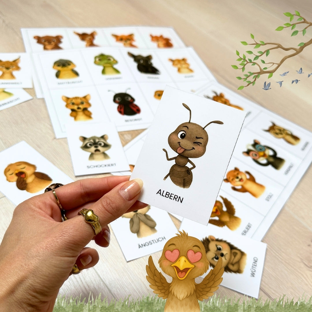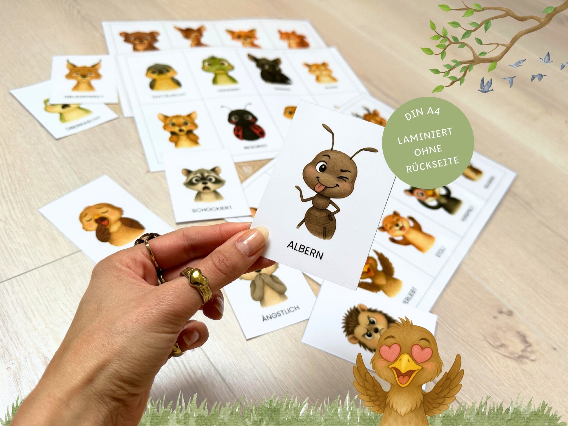Jedes Tier zeigt einen klaren Gesichtsausdruck – und auf der Rückseite gibt es eine einfache Gefühls-Erklärung plus einen spannenden Fun Fact zum Tier.