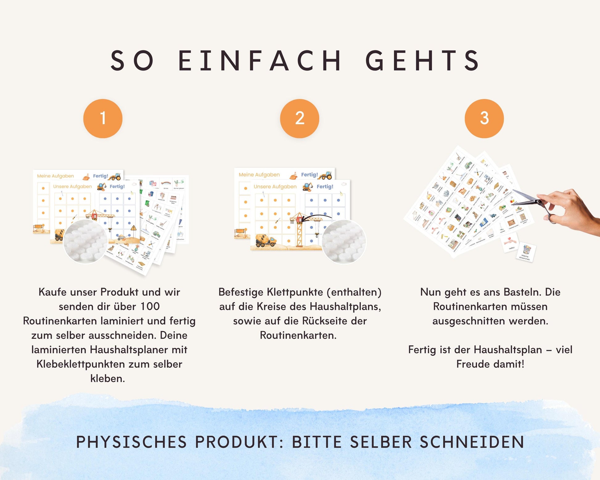 1️⃣ Auspacken & loslegen: Alles ist fertig laminiert und mit Klebeklettpunkten ausgestattet – du kannst direkt starten! Die Routinenkarten müssen nur noch ausgeschnitten werden.