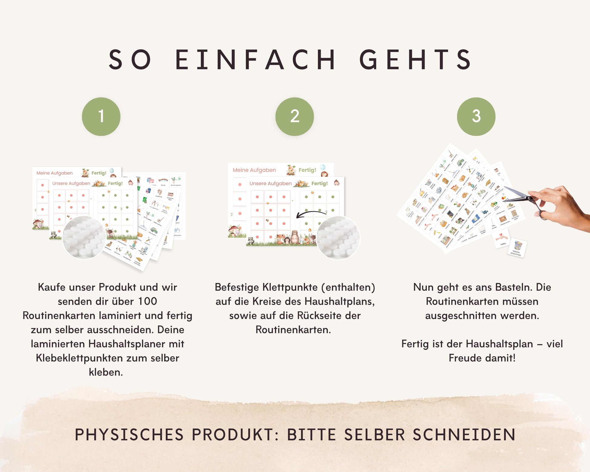 1️⃣ Auspacken & loslegen: Alles ist fertig laminiert und mit Klebeklettpunkten ausgestattet – du kannst direkt starten! Die Routinenkarten müssen nur noch ausgeschnitten werden.