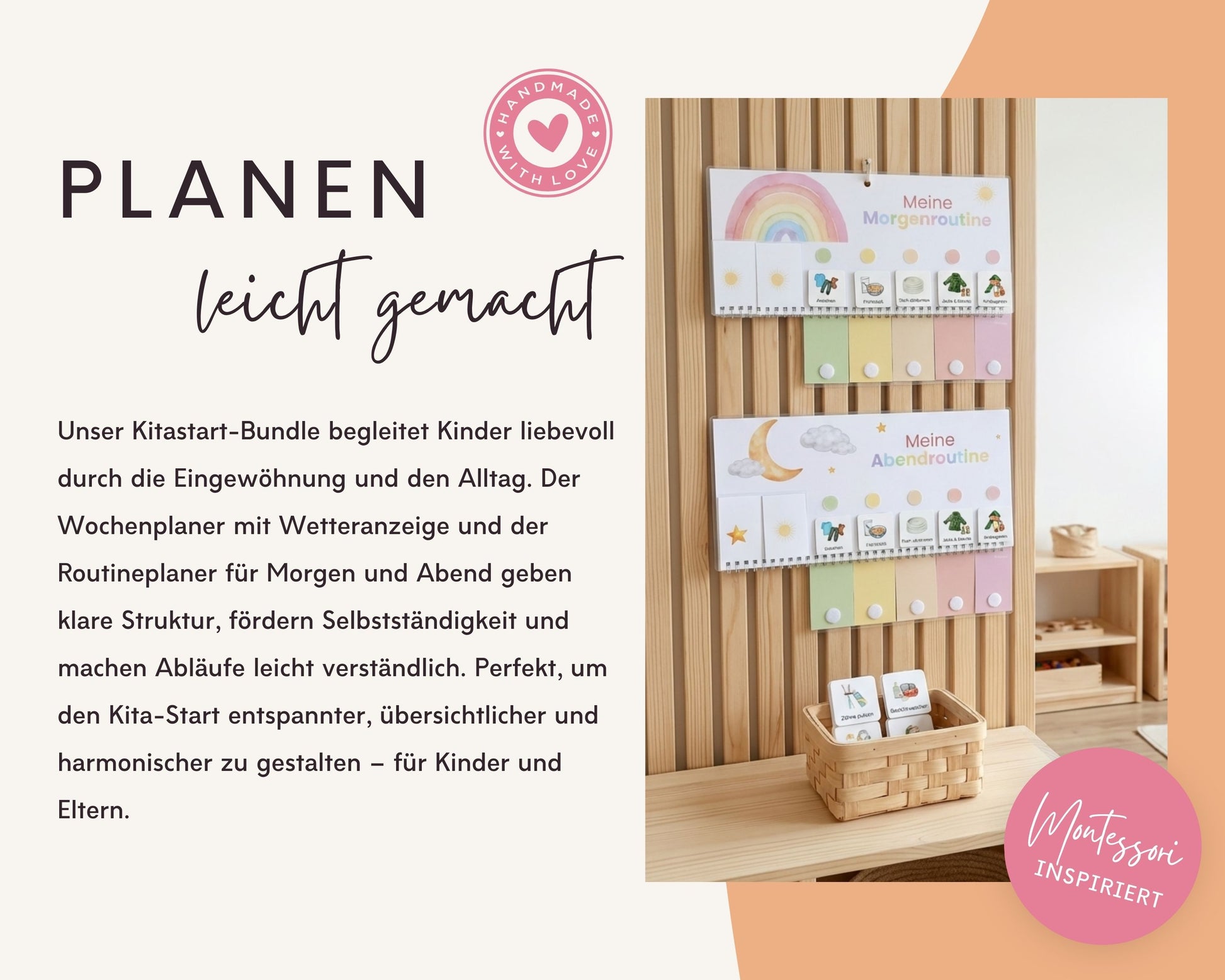 Alle Elemente sind robust, wiederverwendbar und unterstützen eine klare, stressfreie Tages- und Wochenstruktur.