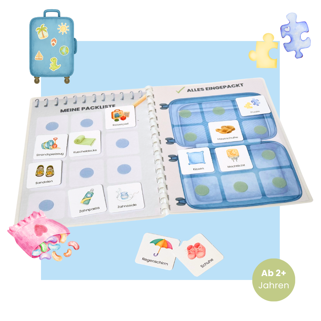 Dank übersichtlicher Kategorien wie Kleidung, Hygiene, Lieblingssachen und Spielzeug behalten Kinder den Überblick. Die visuellen, personalisierbaren Karten zeigen auf einen Blick, was eingepackt wird – ideal für Urlaub, Ausflüge oder Übernachtungen bei Oma & Opa.