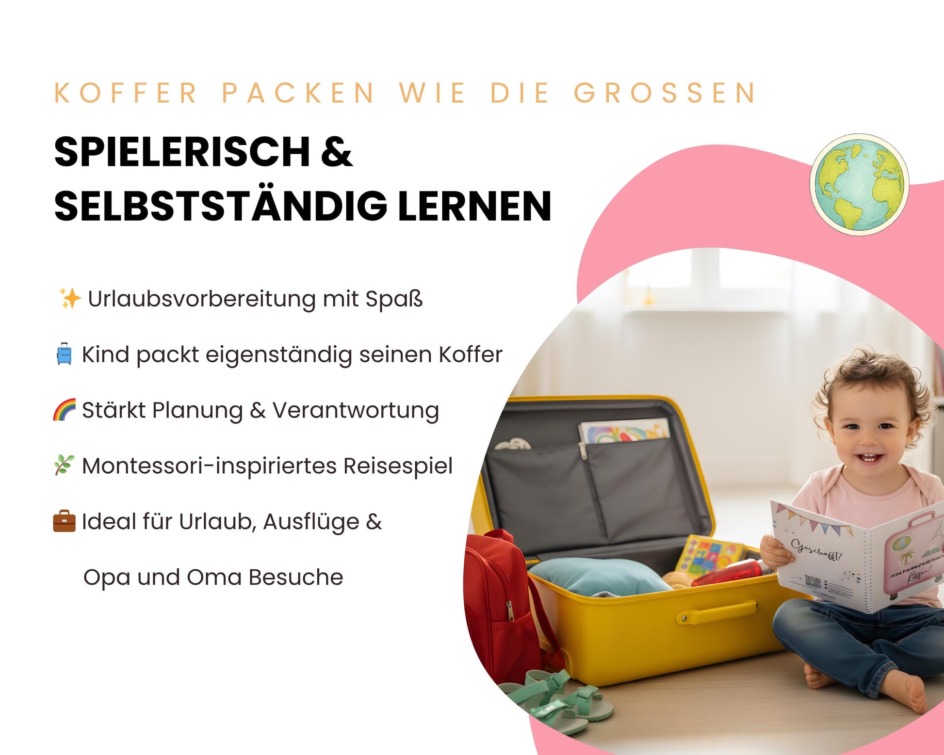 Mit unserem liebevoll gestalteten, Montessori-inspirierten Kofferpack-Set lernen Kinder spielerisch, Verantwortung zu übernehmen und ihren eigenen Koffer selbstständig zu packen – perfekt für den nächsten Urlaub, Wochenendtrip oder den Besuch bei den Großeltern.