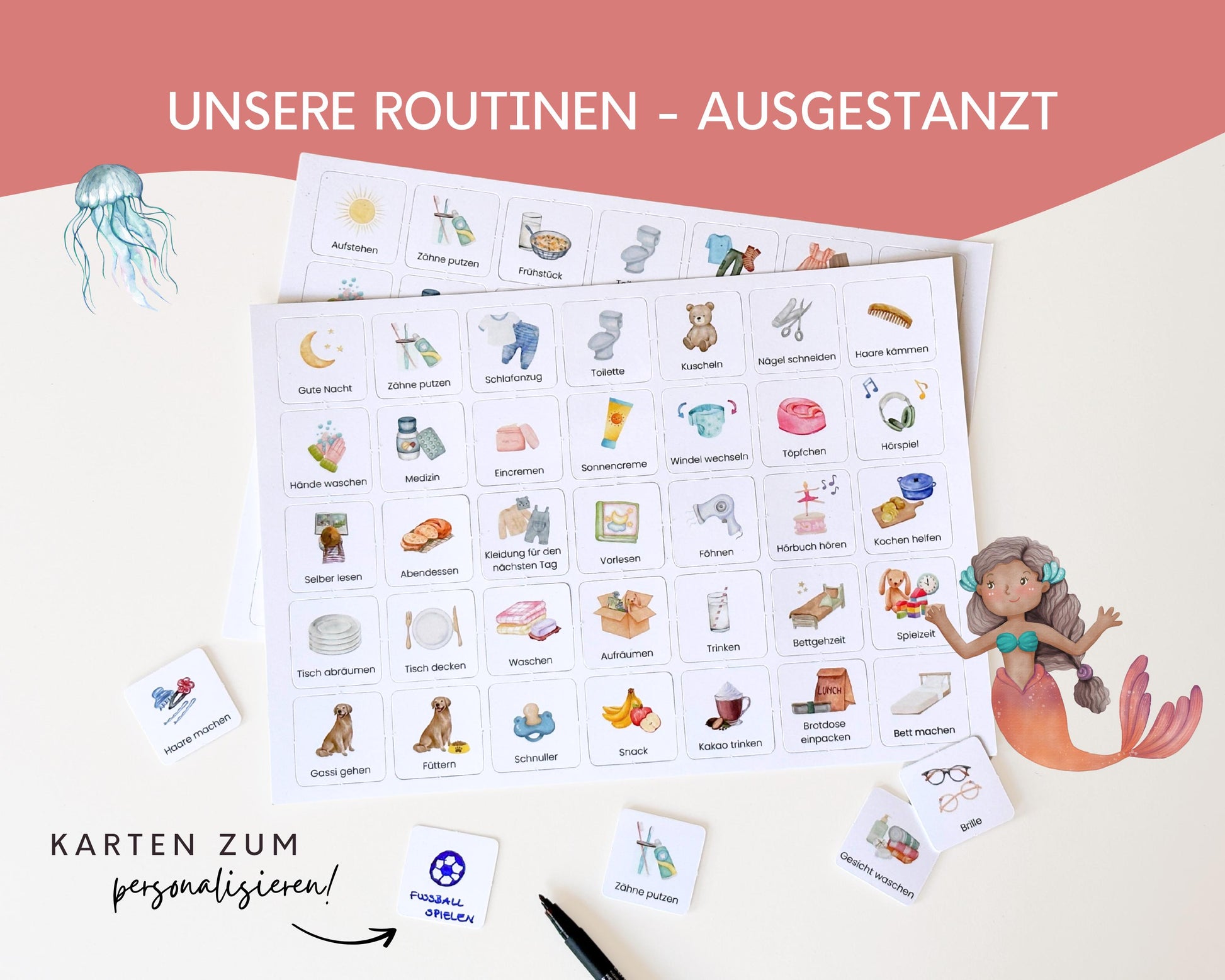 ✔ 5x personalisierbare Routinenkarten (gestanzt, mit Klettklebepunkten zum Befestigen)
