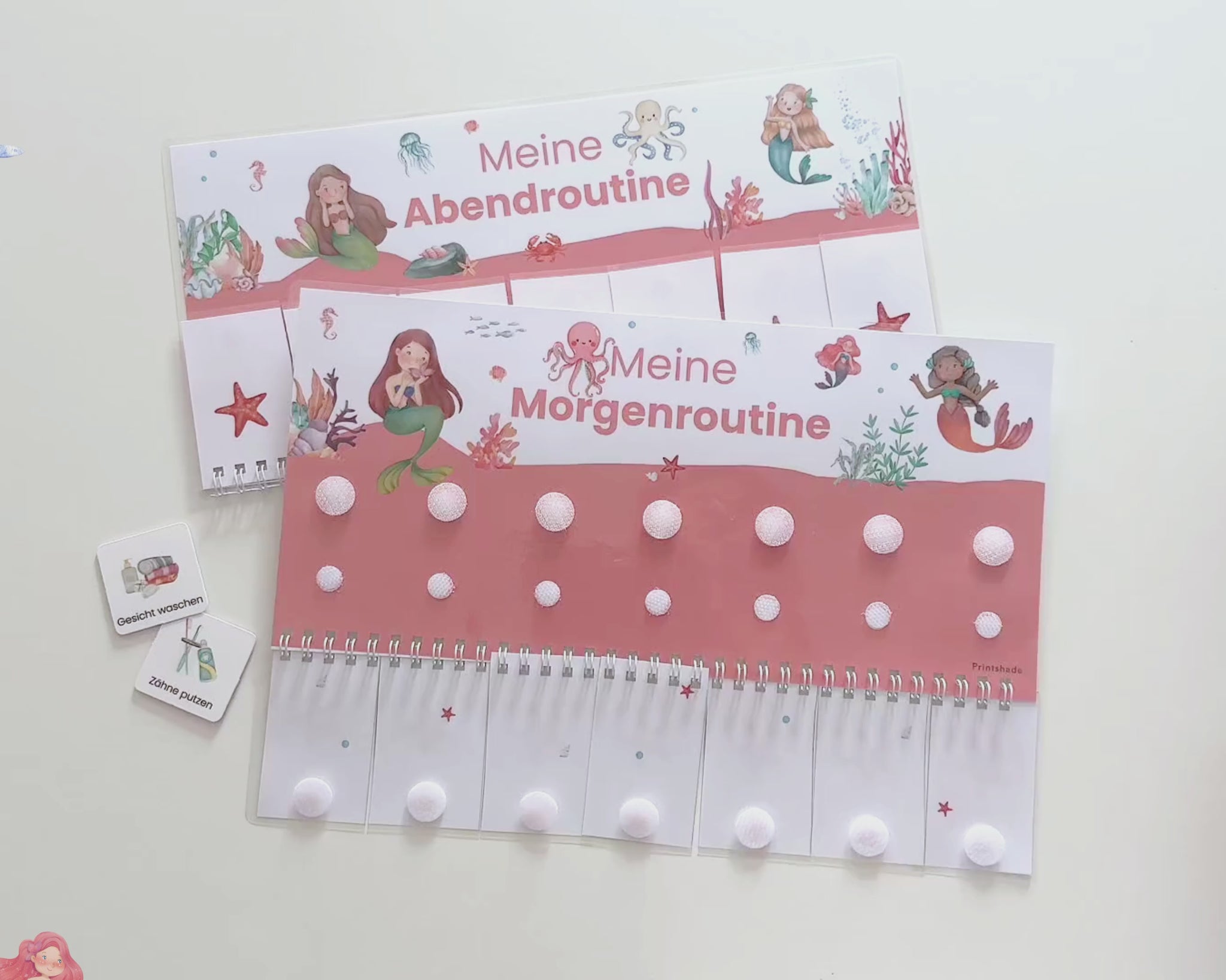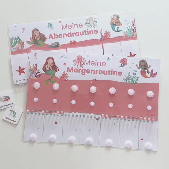 Routineplaner Montessori inkl. Symbolkarten - Design MEERJUNGFRAU ROT - Personalisierbar