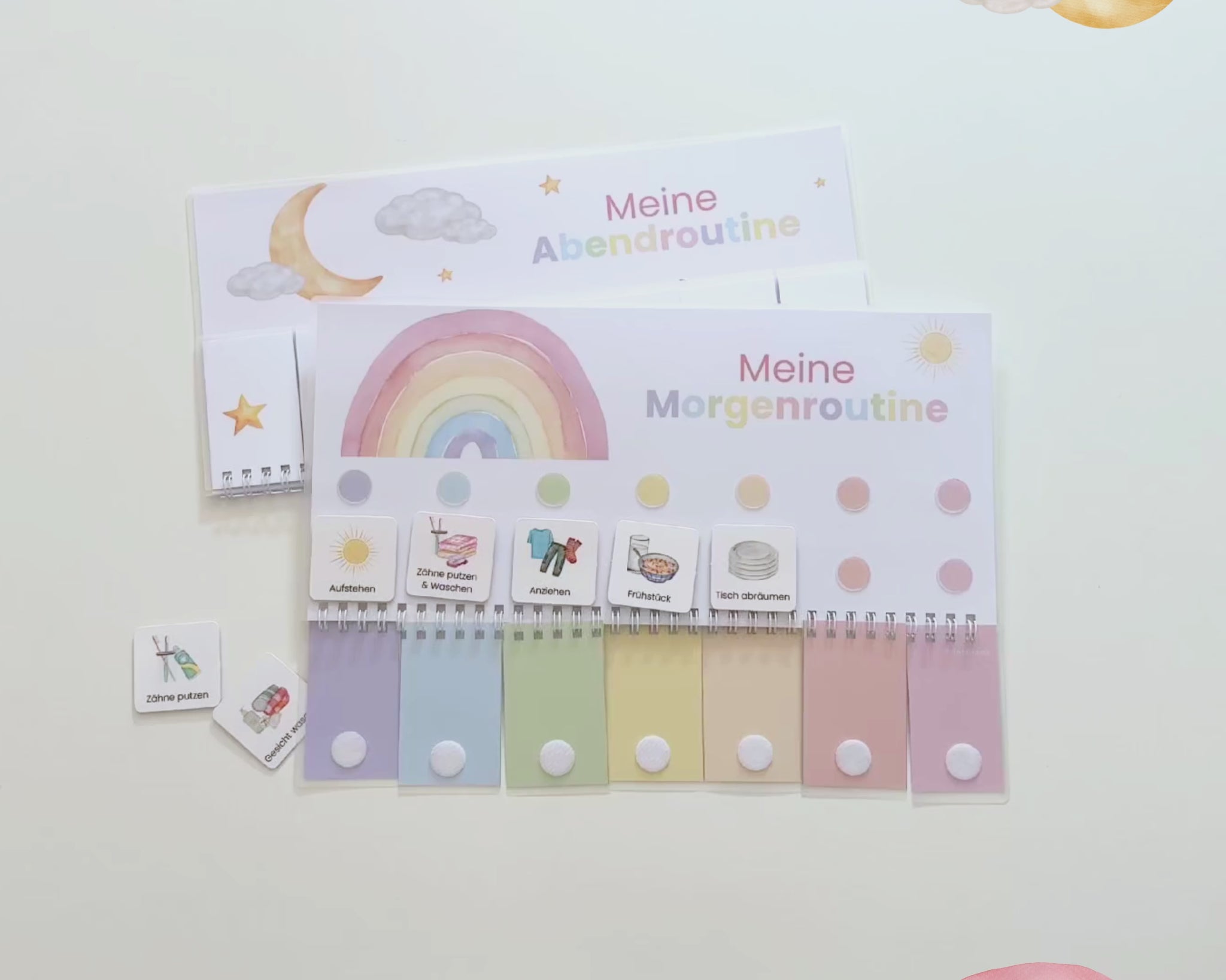 ✔ 30x Morgenroutinenkarten (gestanzt, mit Klettklebepunkten zum Befestigen)