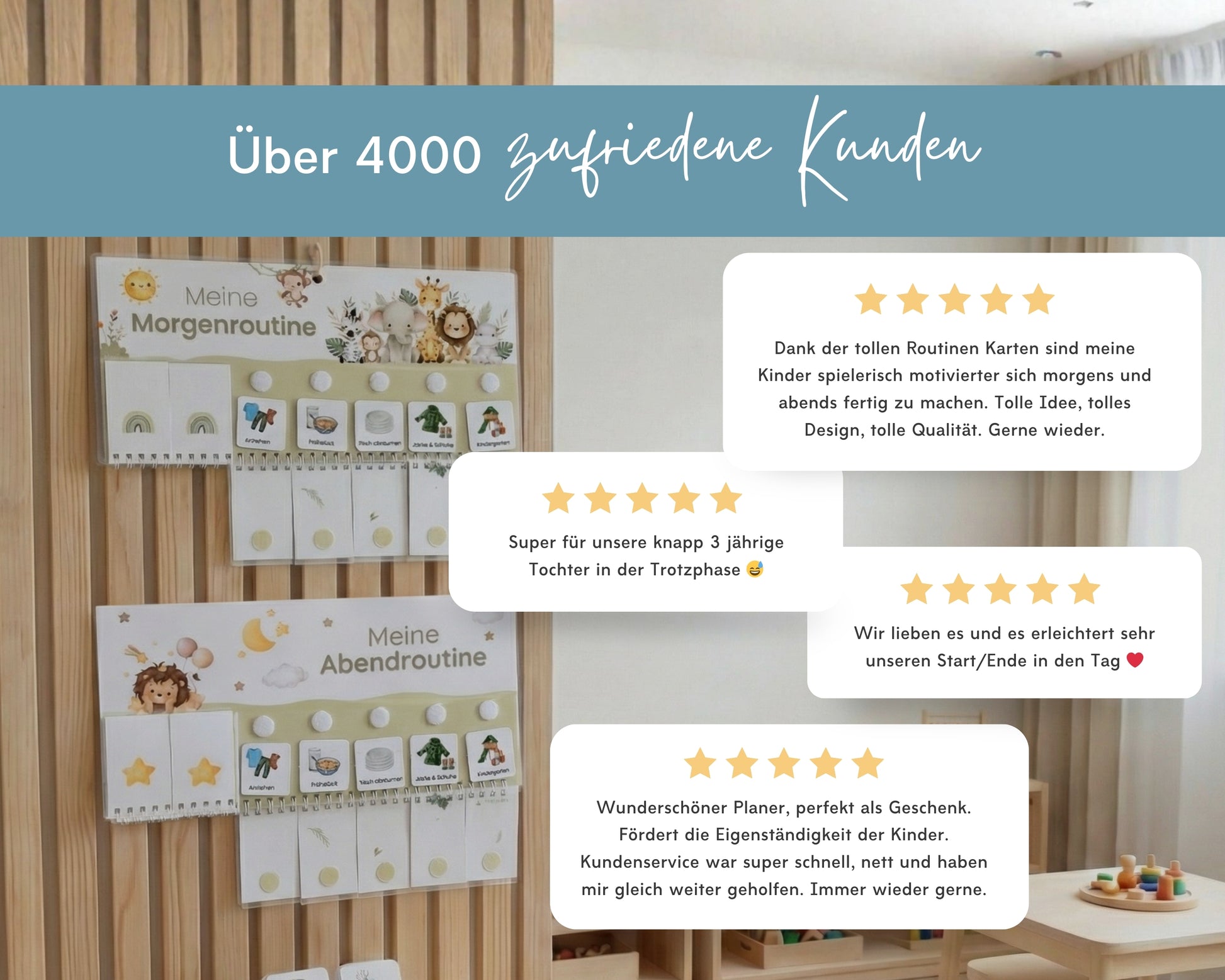 Ob Morgen- oder Abendroutine: Alles ist kindgerecht gestaltet und motiviert dein Kind, Aufgaben selbstständig und mit Stolz zu erledigen.