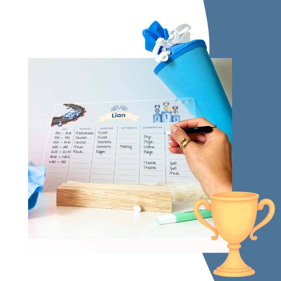 Der personalisierbarere Stundenplan aus hochwertigem Acryl bringt Struktur und Übersicht in den Schulalltag. Dank abwischbarer Oberfläche lässt er sich jederzeit anpassen und wächst flexibel mit dem Schuljahr mit.