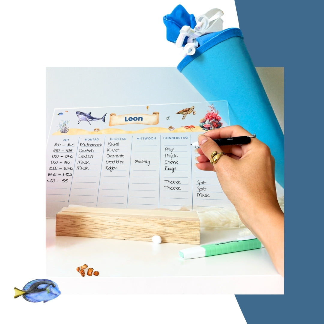 Der personalisierbarere Stundenplan aus hochwertigem Acryl bringt Struktur und Übersicht in den Schulalltag. Dank abwischbarer Oberfläche lässt er sich jederzeit anpassen und wächst flexibel mit dem Schuljahr mit.