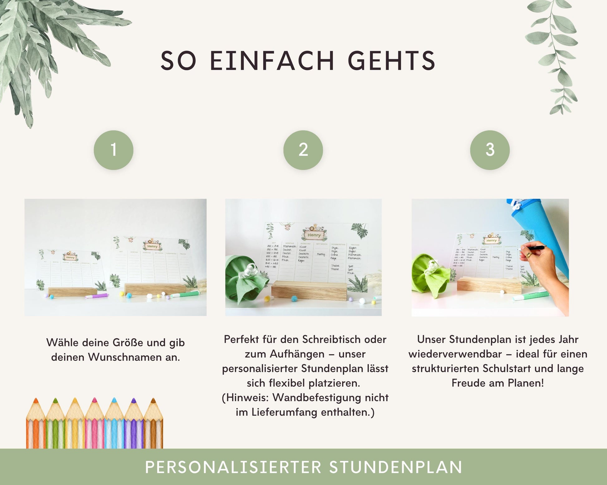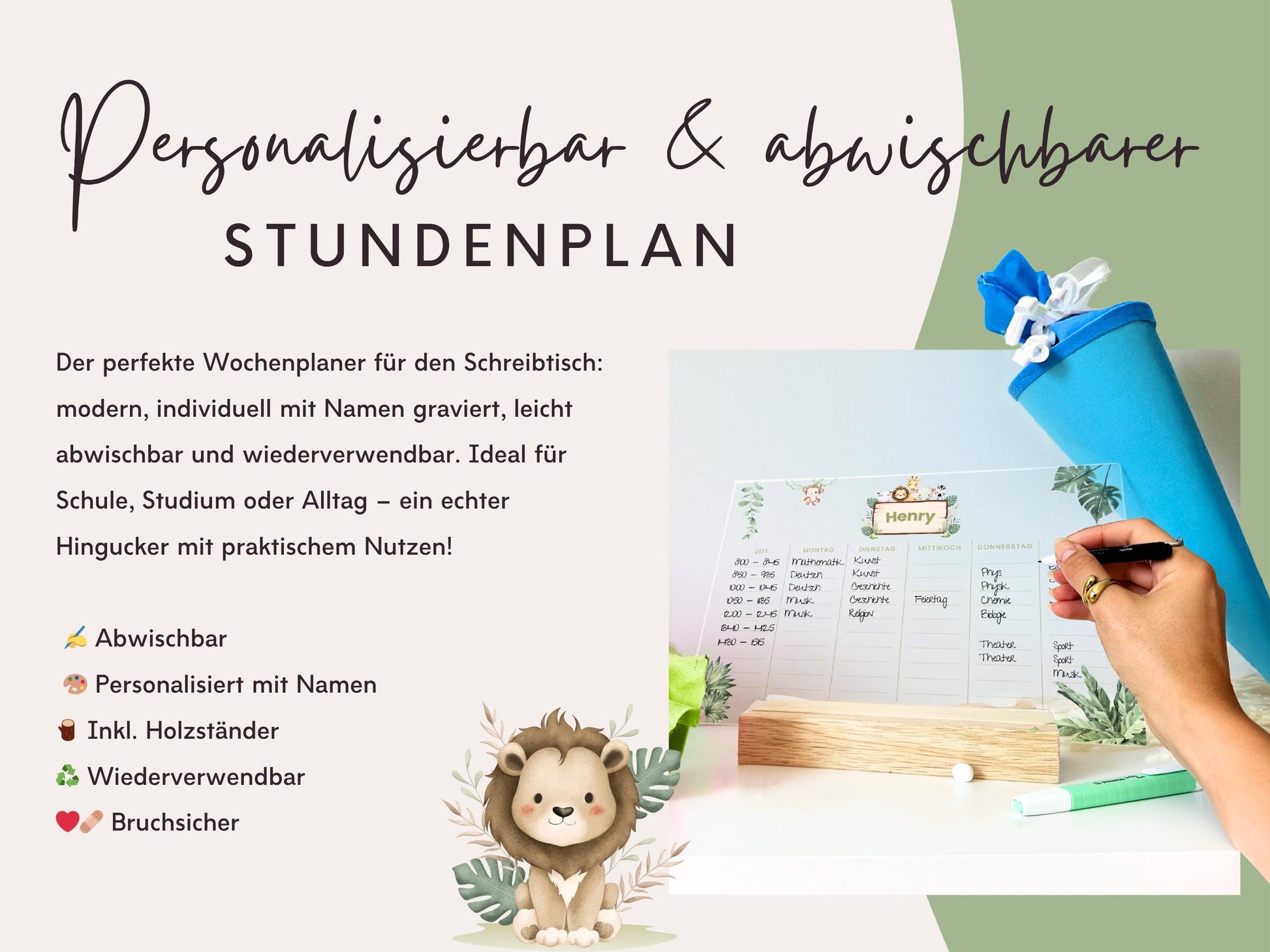 Mach den Schulstart unvergesslich 🎉 – mit unserem personalisierten, abwischbaren Stundenplan aus Acryl inkl. stabilem Holzaufsteller! Handgefertigt in Deutschland mit hochwertigem 3 mm Acryl – perfekt als Einschulungsgeschenk oder Schuljahresstart✨