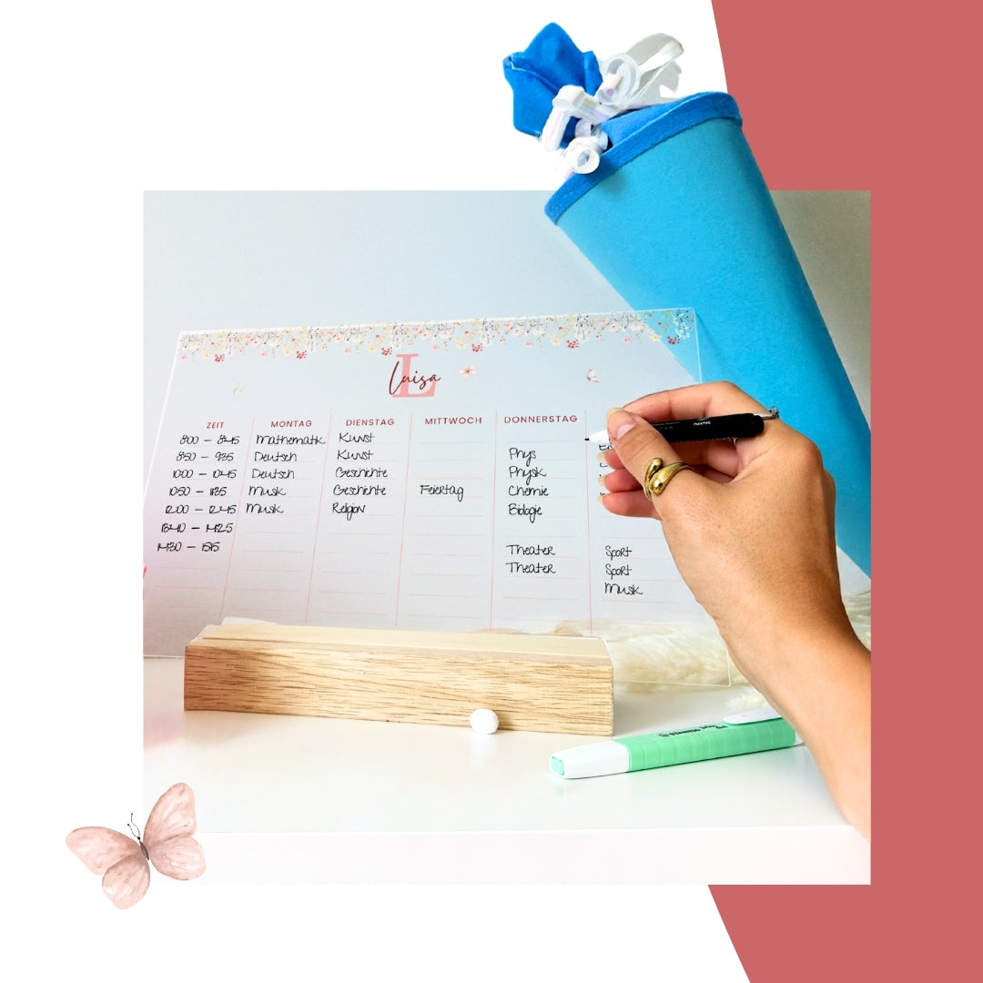 Der personalisierbarere Stundenplan aus hochwertigem Acryl bringt Struktur und Übersicht in den Schulalltag. Dank abwischbarer Oberfläche lässt er sich jederzeit anpassen und wächst flexibel mit dem Schuljahr mit.