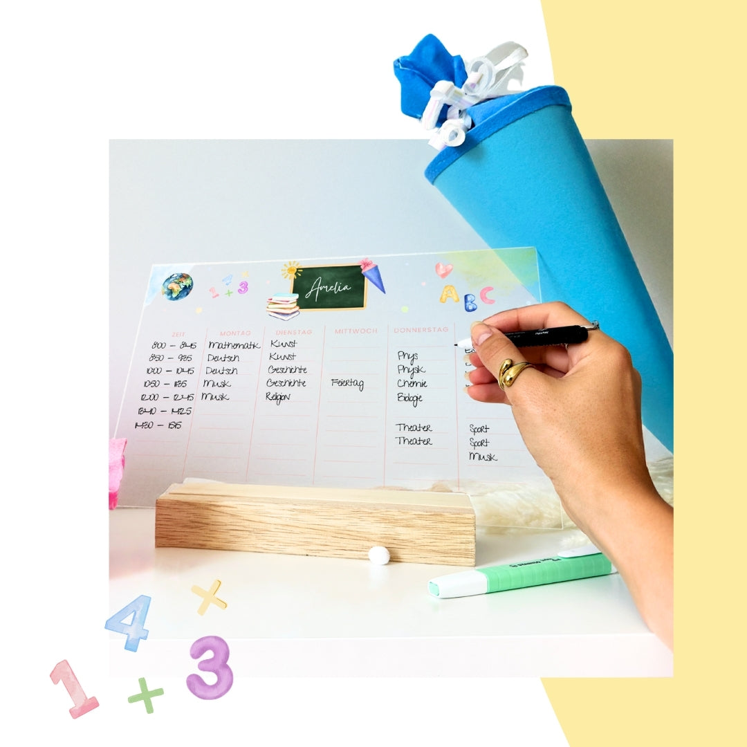 Der personalisierbarere Stundenplan aus hochwertigem Acryl bringt Struktur und Übersicht in den Schulalltag. Dank abwischbarer Oberfläche lässt er sich jederzeit anpassen und wächst flexibel mit dem Schuljahr mit.
