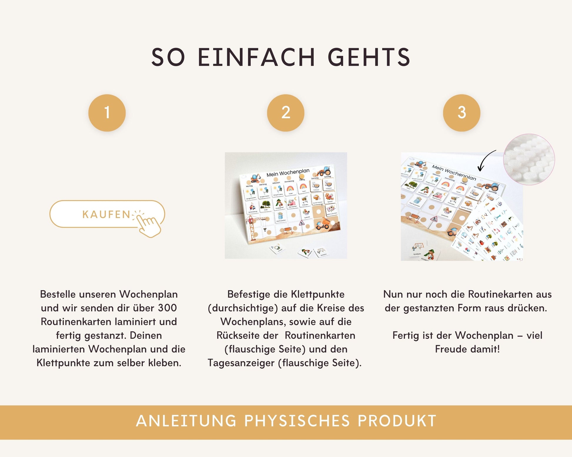1️⃣ Auspacken & loslegen: Alles ist fertig laminiert. Nun die Klebeklettpunkte befestigen, die Routinenkarten ausstanzen und du kannst direkt starten! (Flauschig: Routinenkarten + Tagesanzeiger, Kratzige: Wochenplan + Wochentage)
