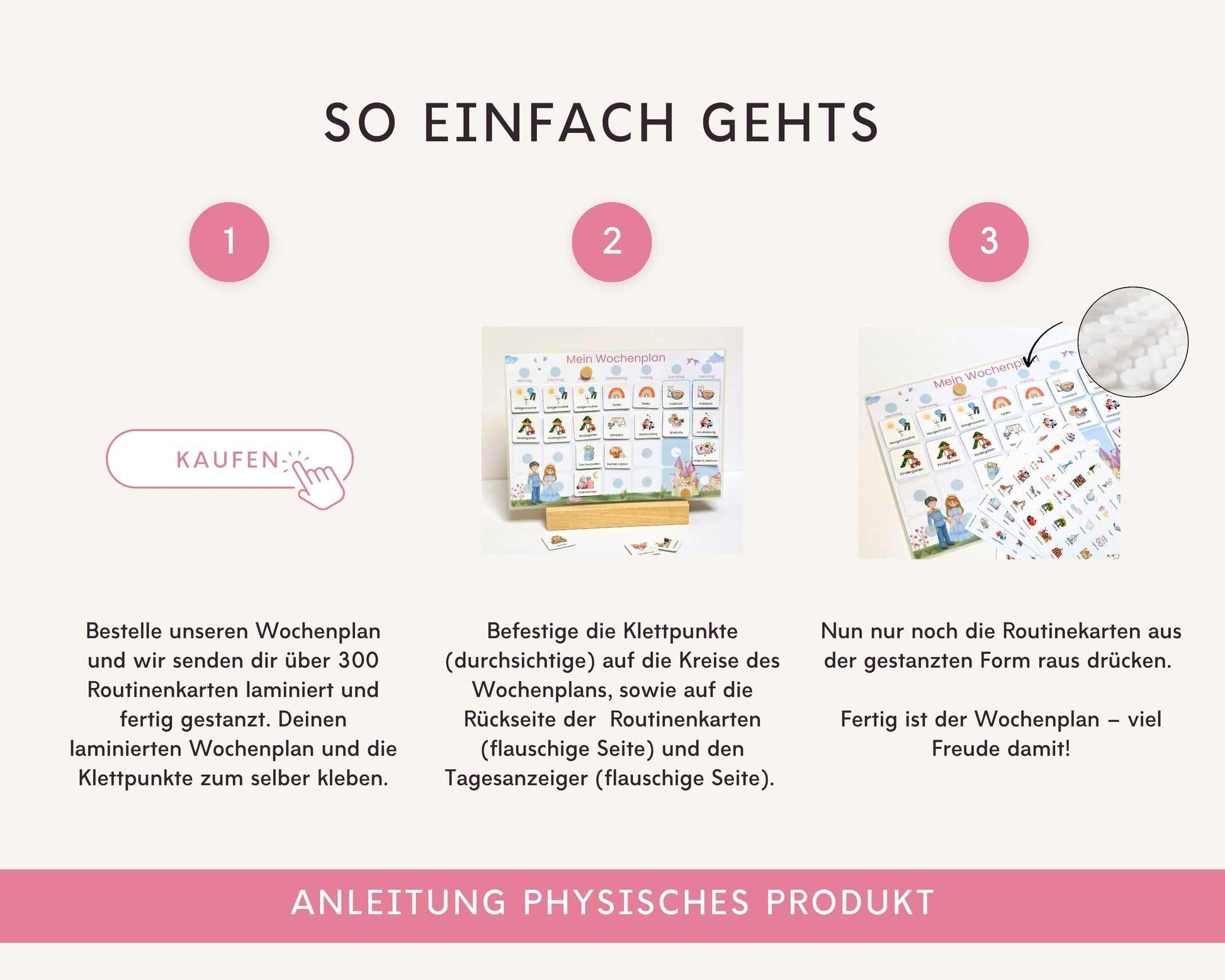 1️⃣ Auspacken & loslegen: Alles ist fertig laminiert. Nun die Klebeklettpunkte befestigen, die Routinenkarten ausstanzen und du kannst direkt starten! (Flauschig: Routinenkarten + Tagesanzeiger, Kratzige: Wochenplan + Wochentage)