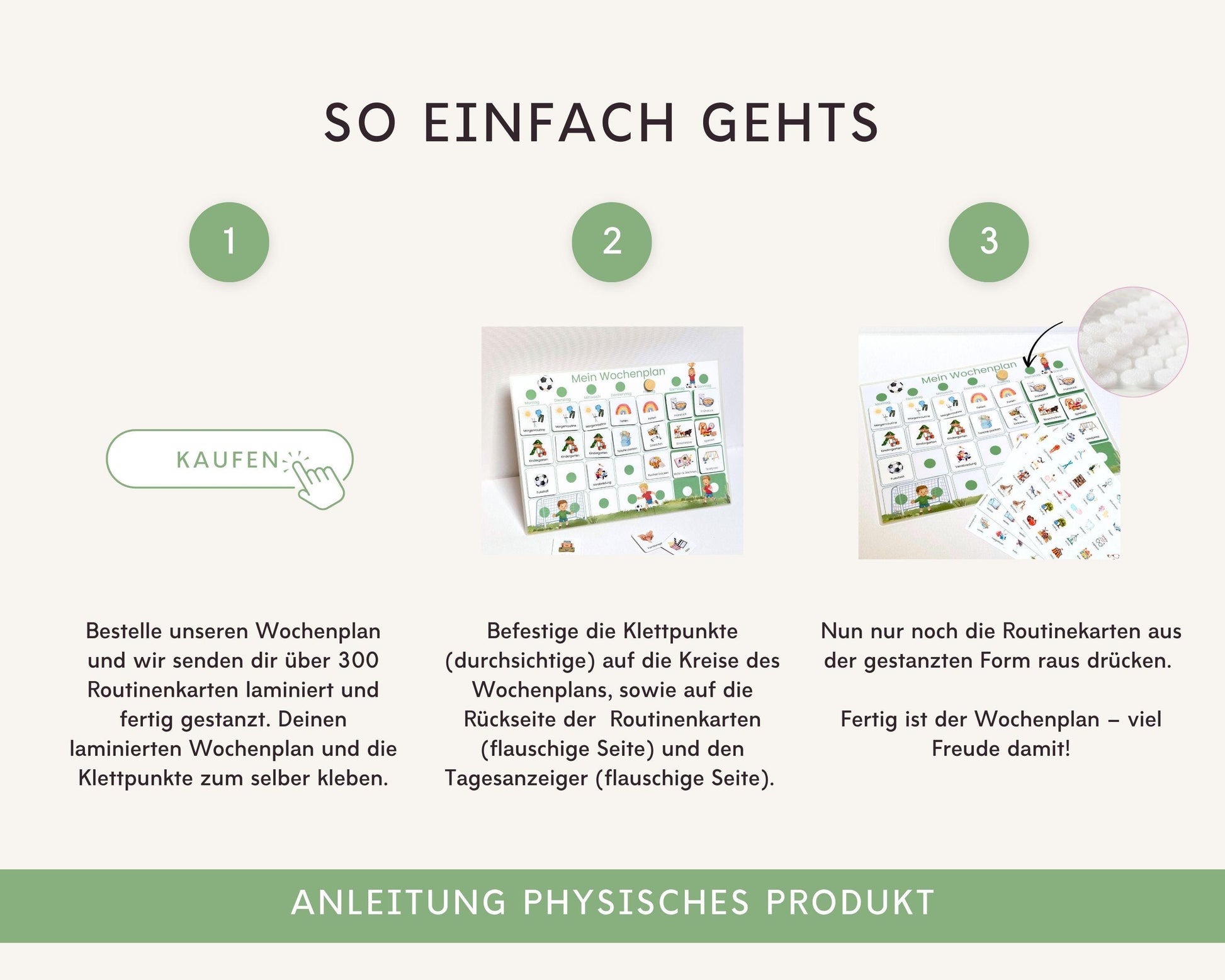 1️⃣ Auspacken & loslegen: Alles ist fertig laminiert. Nun die Klebeklettpunkte befestigen, die Routinenkarten ausstanzen und du kannst direkt starten! (Flauschig: Routinenkarten + Tagesanzeiger, Kratzige: Wochenplan + Wochentage)