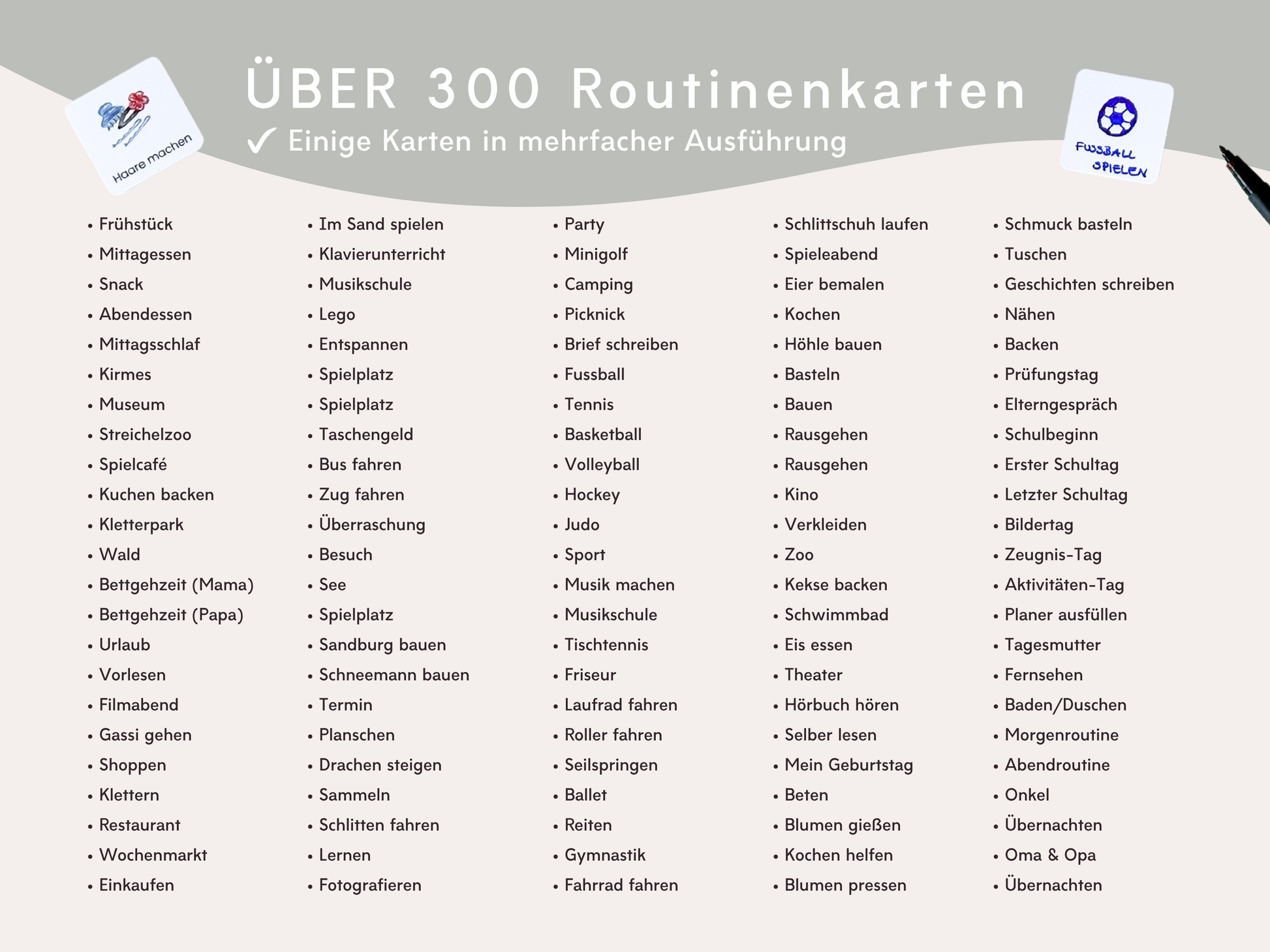 ✔ Über 300 Routinenkarten (gestanzt, mit Klettklebepunkten zum Befestigen)