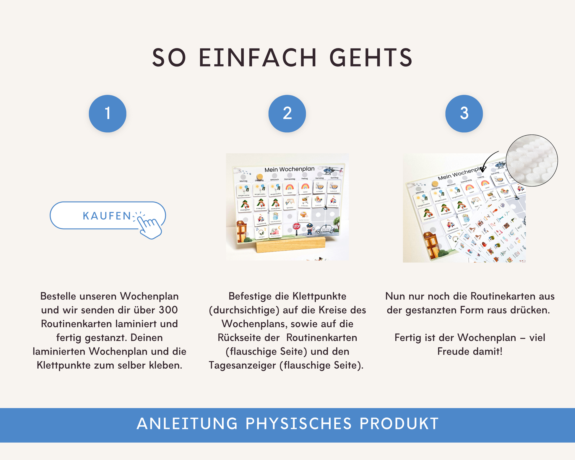 1️⃣ Auspacken & loslegen: Alles ist fertig laminiert. Nun die Klebeklettpunkte befestigen, die Routinenkarten ausstanzen und du kannst direkt starten! (Flauschig: Routinenkarten + Tagesanzeiger, Kratzige: Wochenplan + Wochentage)
