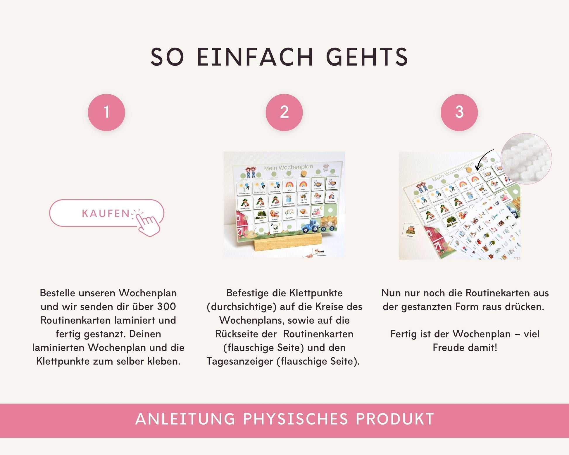 1️⃣ Auspacken & loslegen: Alles ist fertig laminiert. Nun die Klebeklettpunkte befestigen, die Routinenkarten ausstanzen und du kannst direkt starten! (Flauschig: Routinenkarten + Tagesanzeiger, Kratzige: Wochenplan + Wochentage)