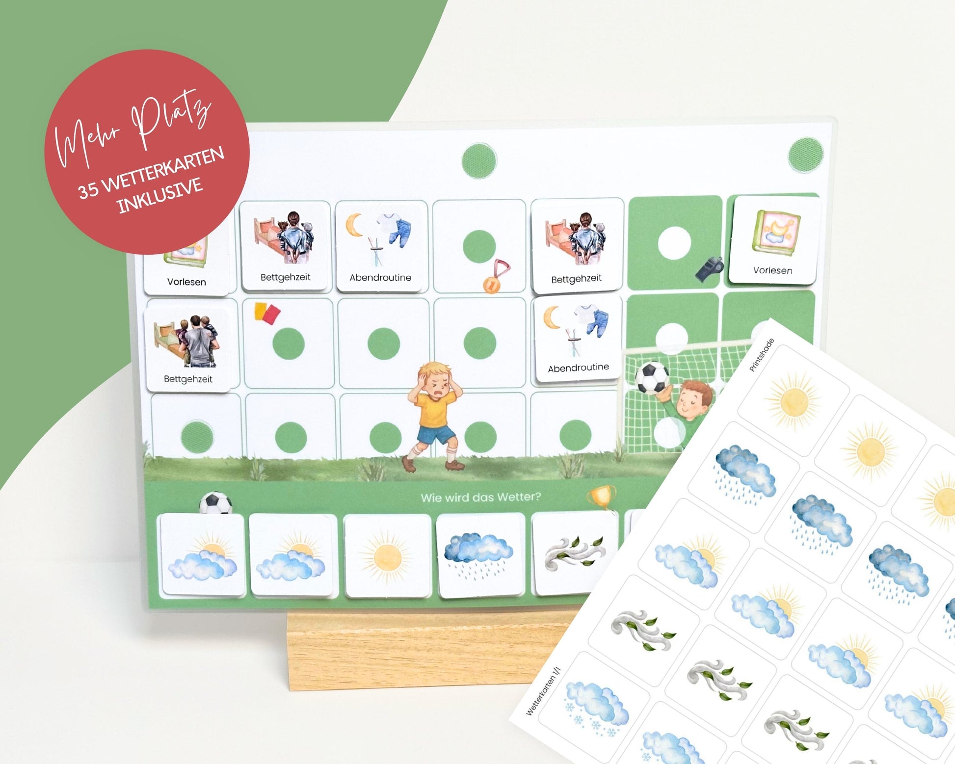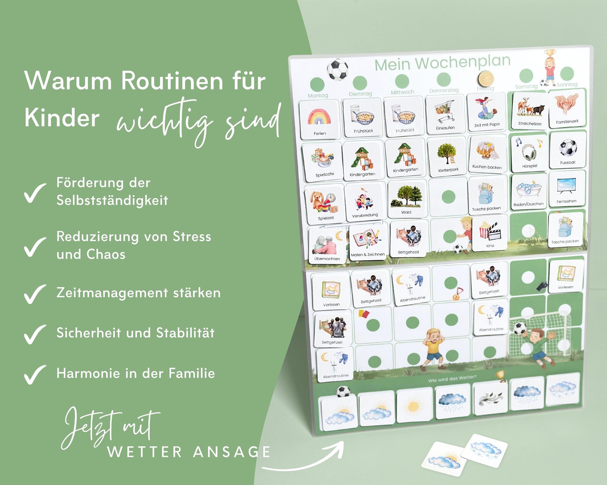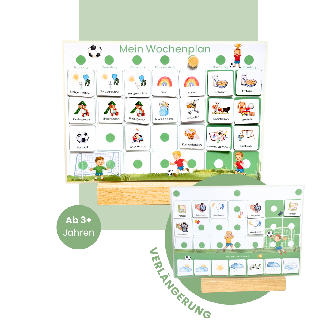 Wochenplan-Verlängerung FUSSBALL mit Wetteranzeige | 35 Wetterkarten + Klettpunkte | Ergänzungs-Set für Wochenplan Kinder