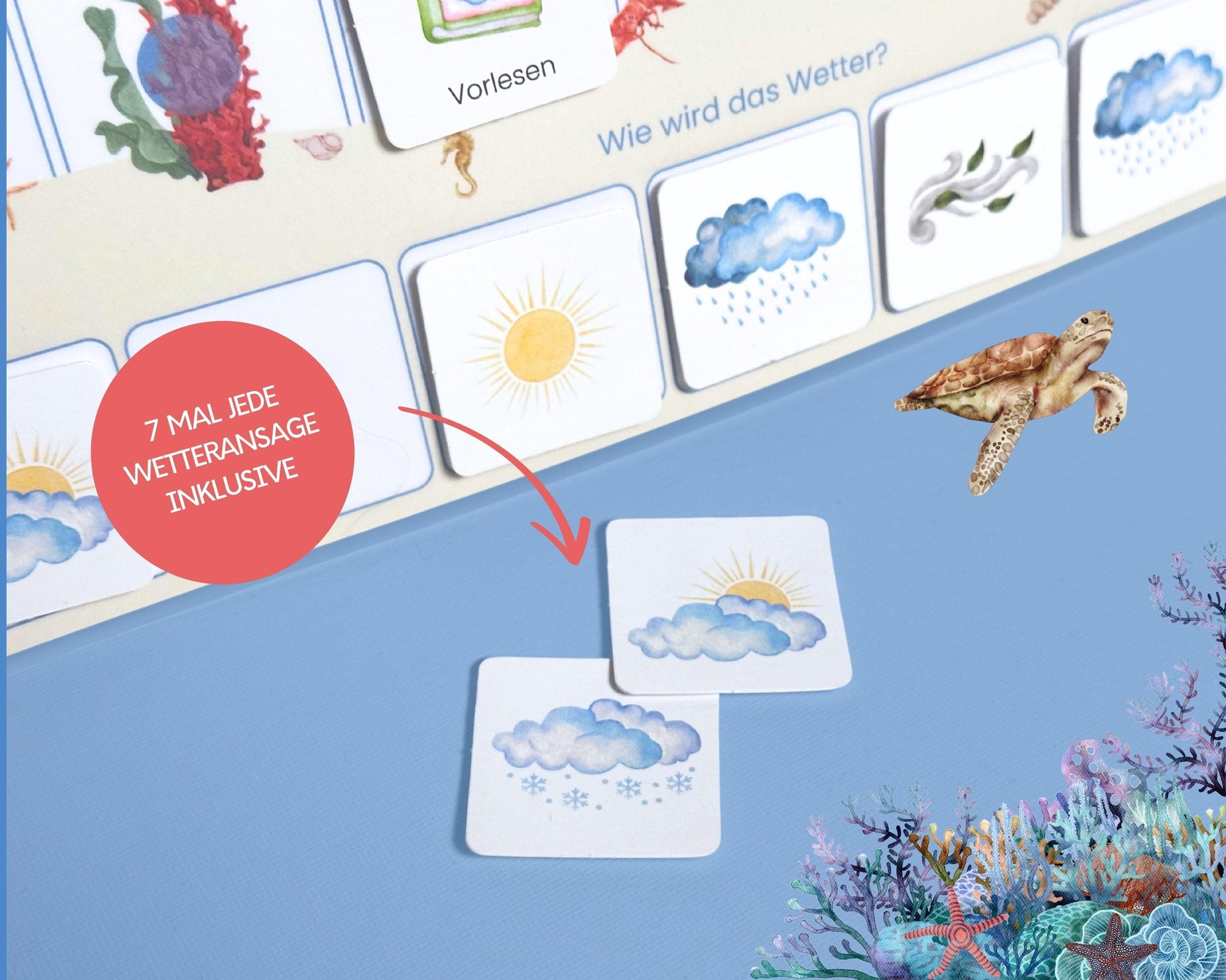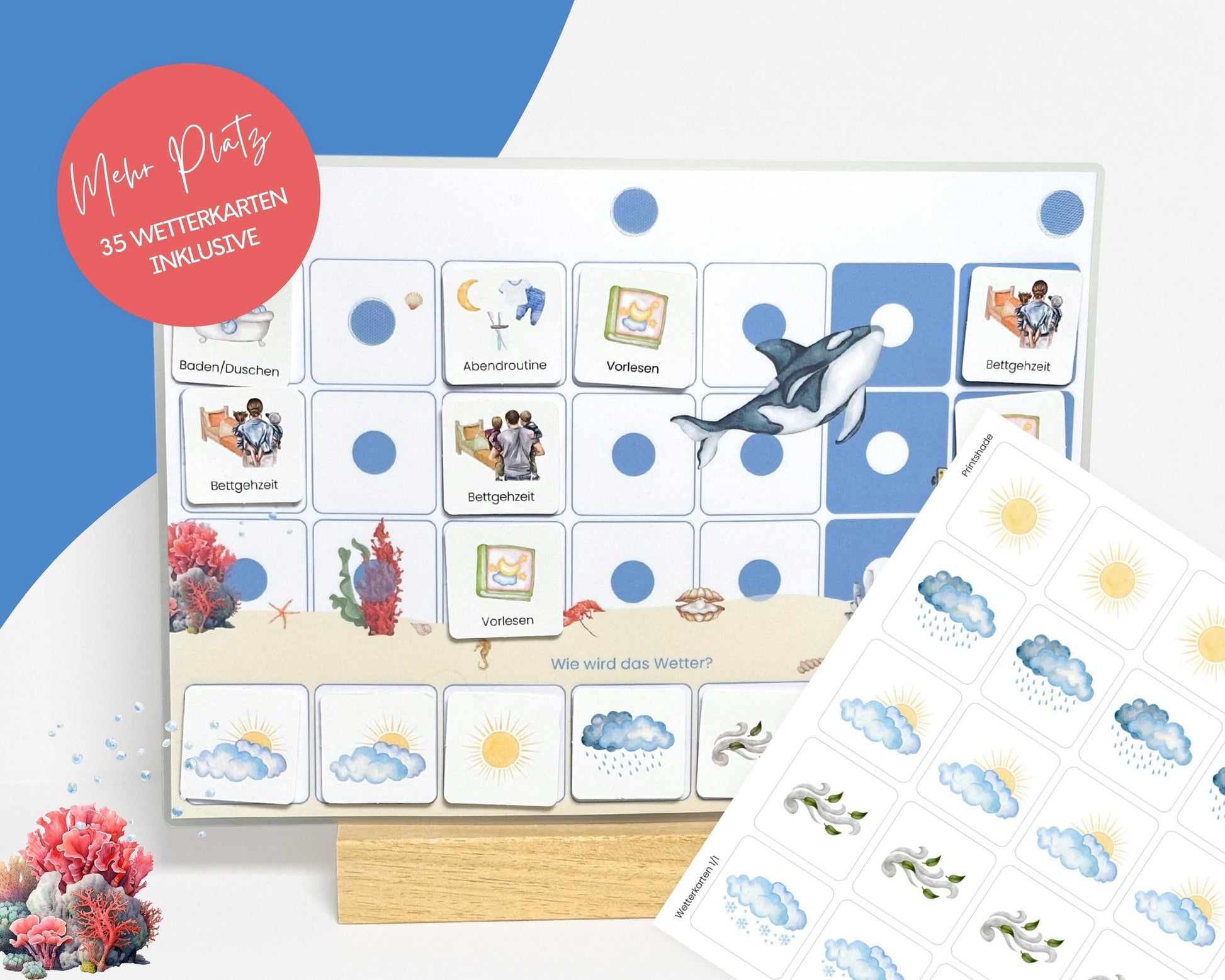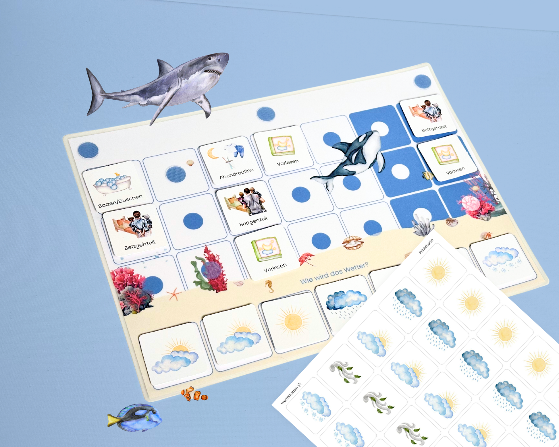Wochenplan-Verlängerung MEER HAI WAL mit Wetteranzeige | 35 Wetterkarten + Klettpunkte | Ergänzungs-Set für Wochenplan Kinder