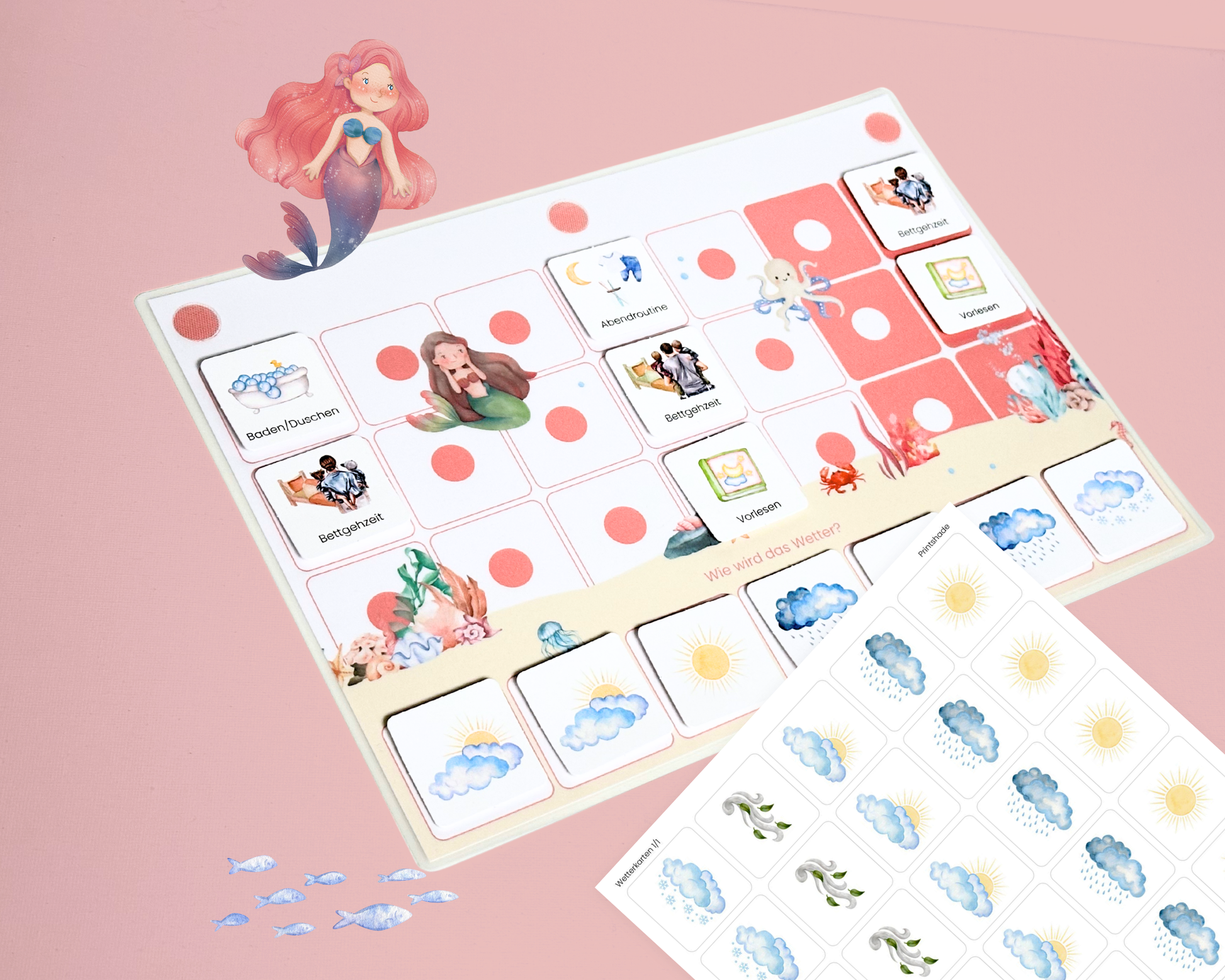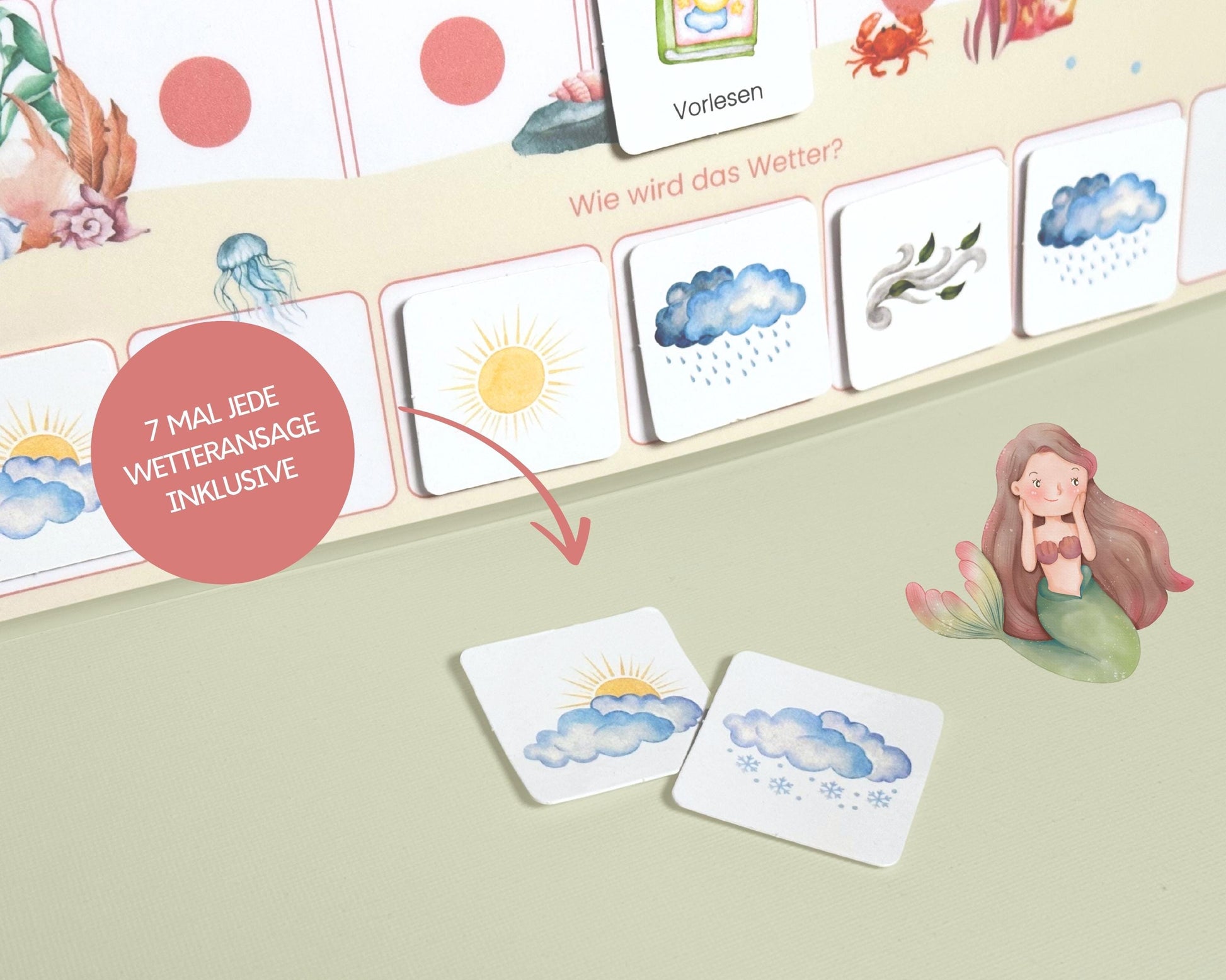 Wochenplan-Verlängerung MEERJUNGFRAU ROT UNTERWASSERWELT mit Wetteranzeige | 35 Wetterkarten + Klettpunkte | Ergänzungs-Set für Wochenplan Kinder