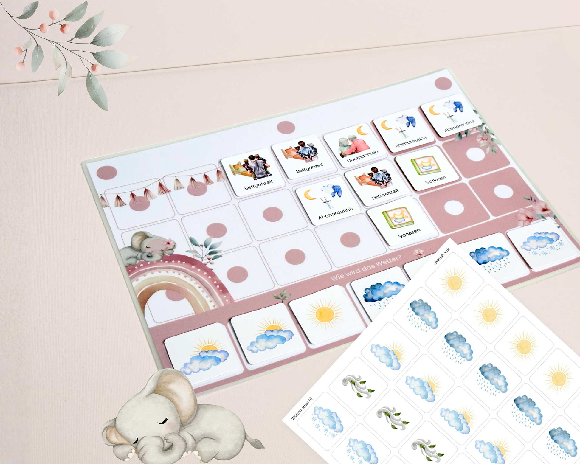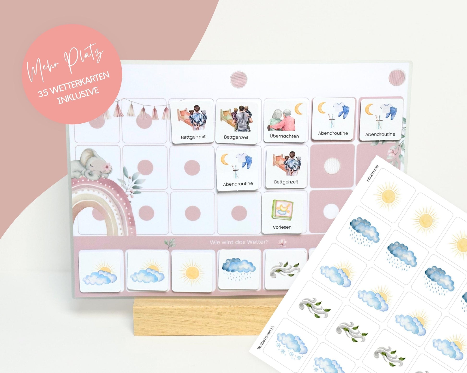 Wochenplan-Verlängerung ELEFANT BOHO ROSA mit Wetteranzeige | 35 Wetterkarten + Klettpunkte | Ergänzungs-Set für Wochenplan Kinder