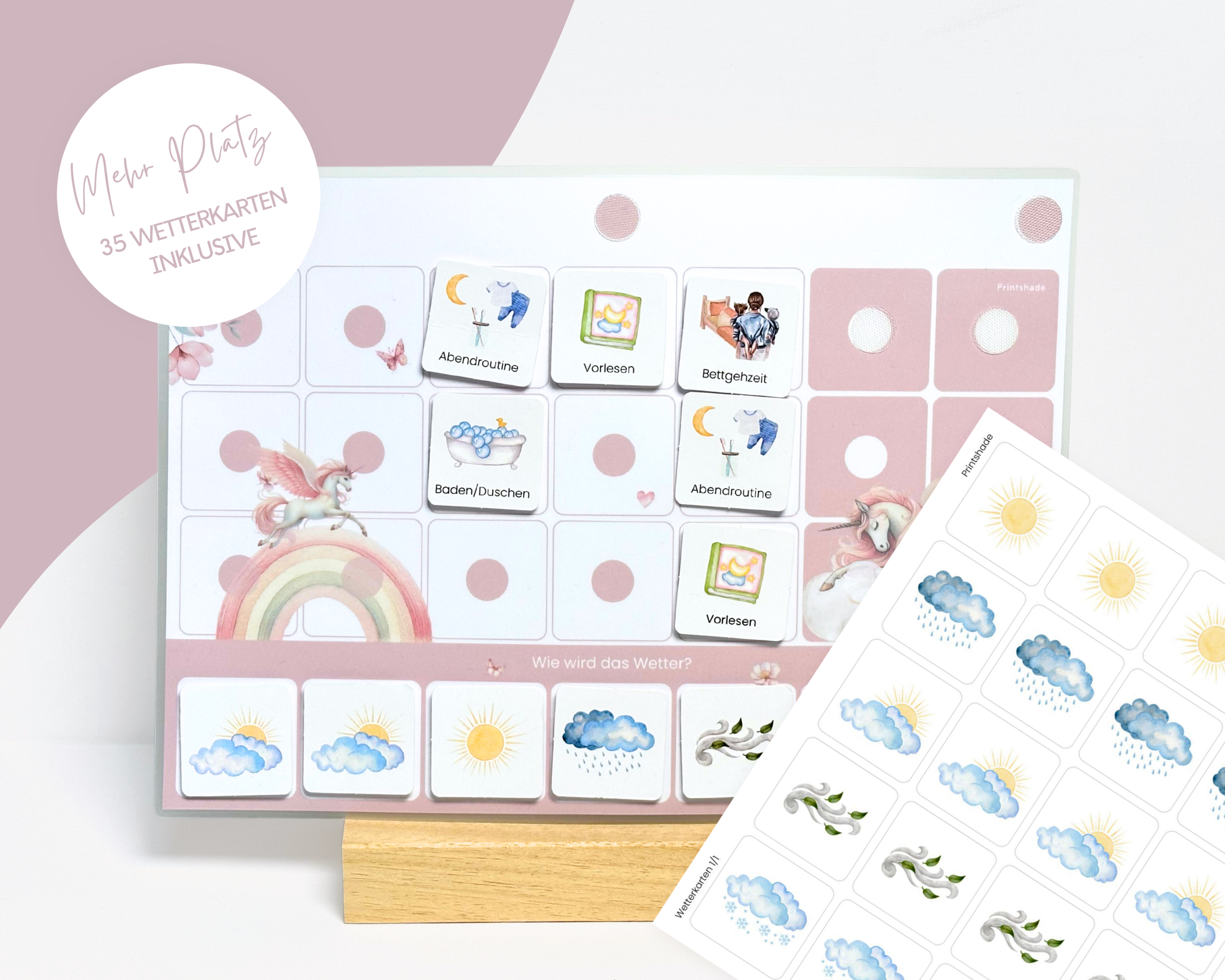 Die Erweiterung ist bereits laminiert und sofort einsatzbereit. Befestige sie mit den beiliegenden Klettpunkten am bestehenden Wochenplan – ganz ohne Basteln.